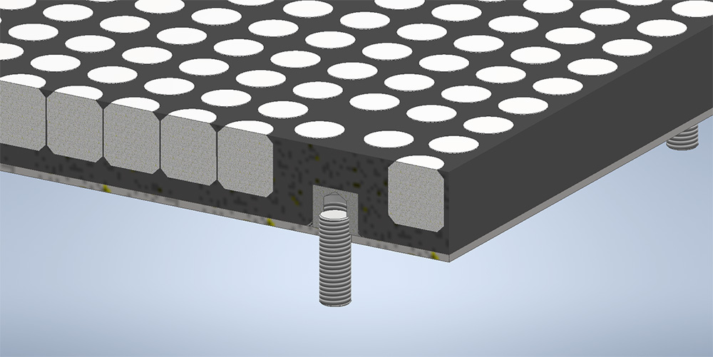 Osadenie tohto paketu na oceľovú platnú potom umožňuje jednoduchý spôsob kotvenia či už prostredníctvom kotviacich otvorov, alebo prostredníctvom integrovaných skrutiek podľa požiadaviek zákazníka.