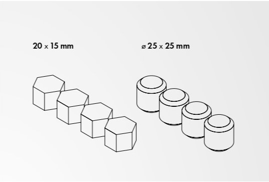 - Varianty uchytenia: zapustené diery (pre uchytenie skrutkov) dostupné vrátane krycej zátky), so závitovou tyčou zo spodnej strany, alebo s magnetmi